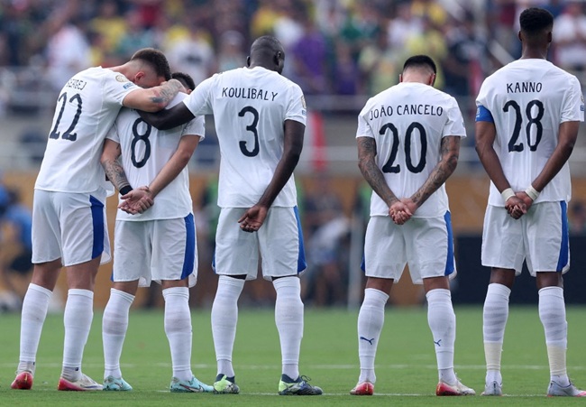 ORLANDO, FLORIDA – JULY 04: Sergej Milinkovic-Savic #22, Ruben Neves #8 and Kalidou Koulibaly #3 of Al Hilal react during a moments silence in memory of former football player Diogo Jota and his brother Andre Silva, who passed away on the 3rd of July 2025 prior to the FIFA Club World Cup 2025 quarter final match between Fluminense FC and Al Hilal at Camping World Stadium on July 04, 2025 in Orlando, Florida. Megan Briggs/Getty Images/AFP (Photo by Megan Briggs / GETTY IMAGES NORTH AMERICA / Getty Images via AFP)