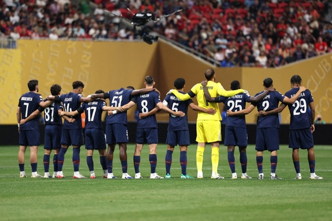 ATLANTA, GEORGIA – JULY 05: Players of Paris Saint-Germain line up to observe a moment of silence in tribute to football players Diogo Jota and his brother Andre Silva, after they passed away on the 3rd of July 2025 prior to the FIFA Club World Cup 2025 quarter-final match between Paris Saint-Germain and FC Bayern München at Mercedes-Benz Stadium on July 05, 2025 in Atlanta, Georgia. Kevin C. Cox/Getty Images/AFP (Photo by Kevin C. Cox / GETTY IMAGES NORTH AMERICA / Getty Images via AFP)