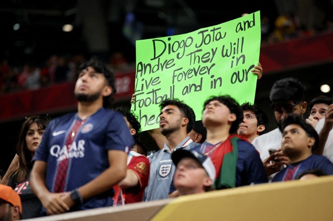 ATLANTA, GEORGIA – JULY 05: Fans observe a moment of silence in tribute to football players Diogo Jota and his brother Andre Silva, after they passed away on the 3rd of July 2025 prior to the FIFA Club World Cup 2025 quarter-final match between Paris Saint-Germain and FC Bayern München at Mercedes-Benz Stadium on July 05, 2025 in Atlanta, Georgia. Alex Grimm/Getty Images/AFP (Photo by ALEX GRIMM / GETTY IMAGES NORTH AMERICA / Getty Images via AFP)