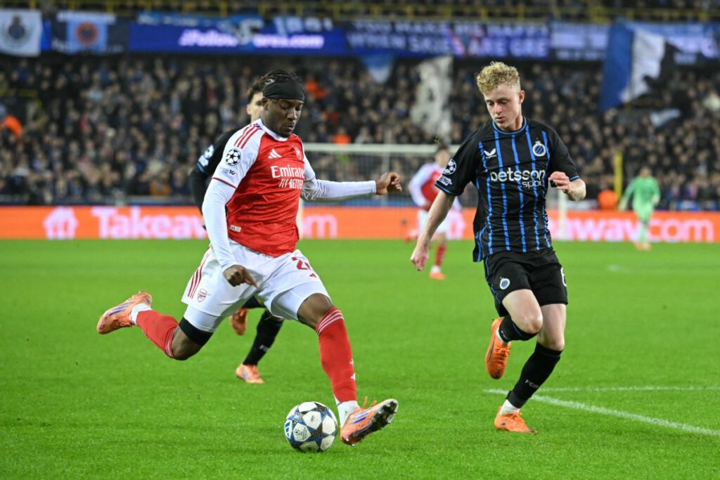 But minutes later Arsenal were ahead after Madueke’s breathtaking strike. The winger picked the ball up just inside the Brugge half, on the right of the Gunners’ attack.