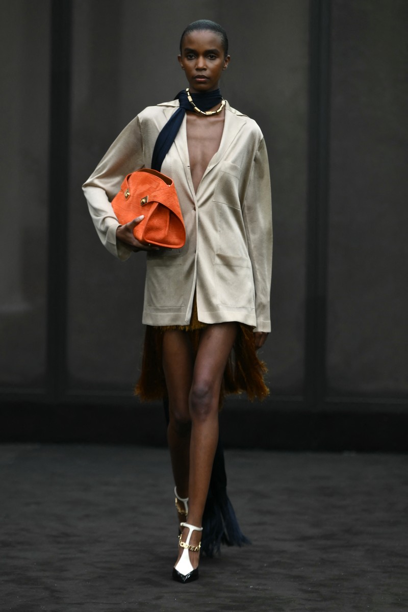 Ferragamo designer Maximilian Davis went back to the 1920s with a chic and colourful collection of speakeasy suits and dresses with dropped waists, low-slung backs and long tassels, with a flash of animal print.