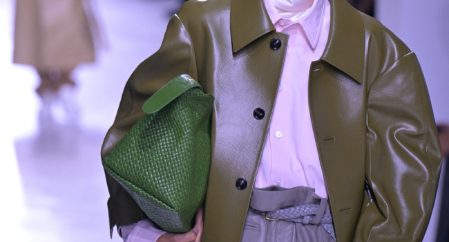 At Tod’s, oversized striped shirts were laid over leather minis, while there were more stripes, diagonal this time, on draped dresses and matching handbags in warm, natural tones.